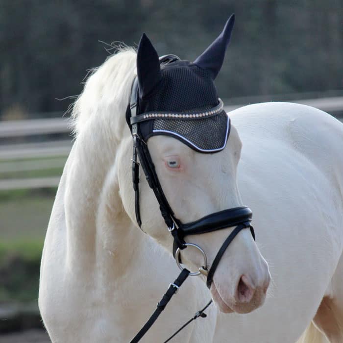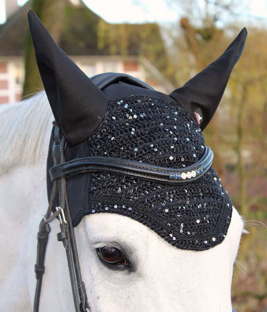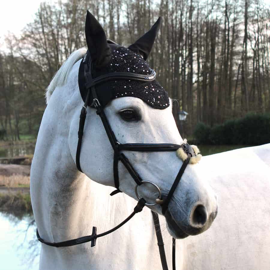 This fly hat has ears made of a sound-absorbing material. The composition and thickness of the material absorbs noise from the surroundings, allowing the horse to concentrate better on its rider.