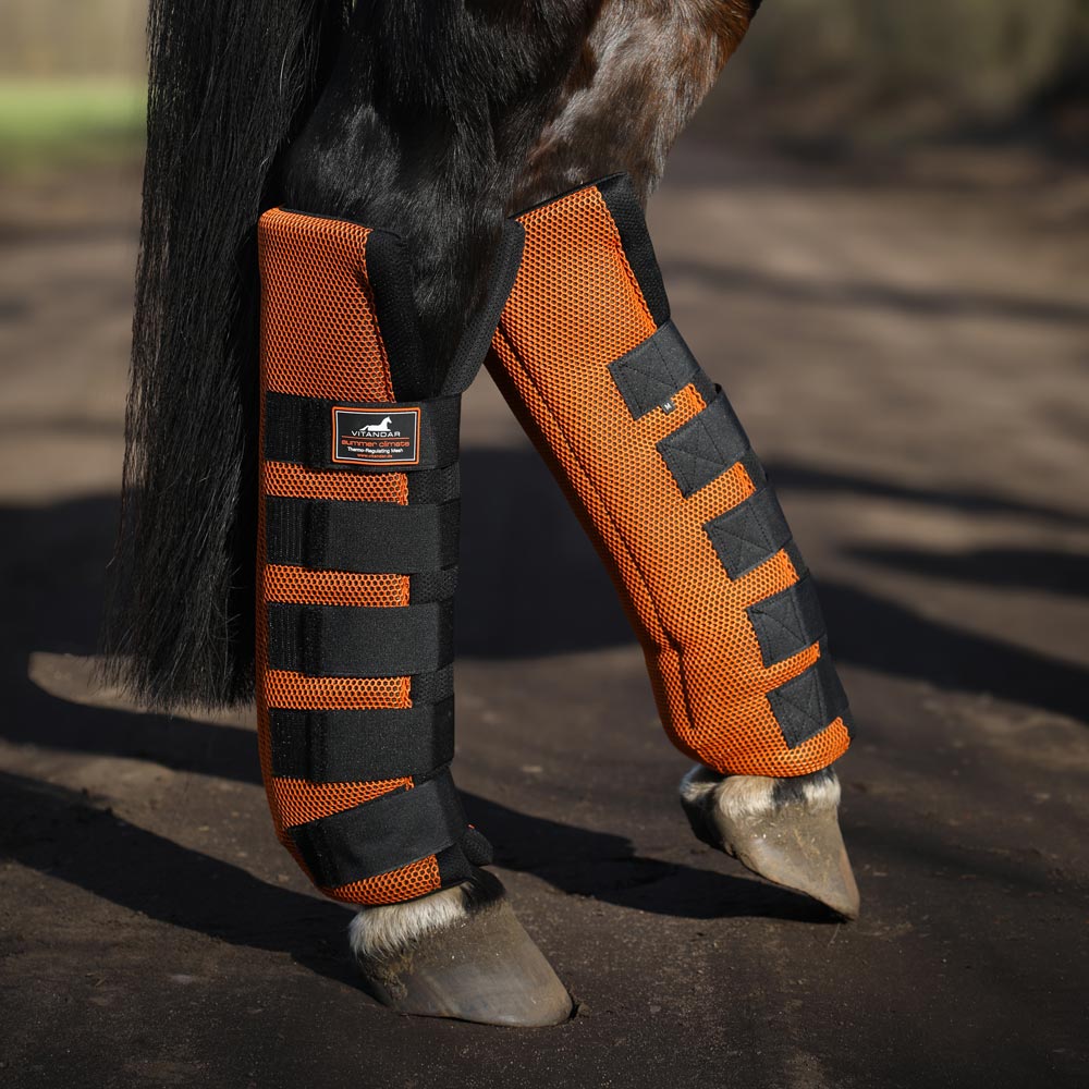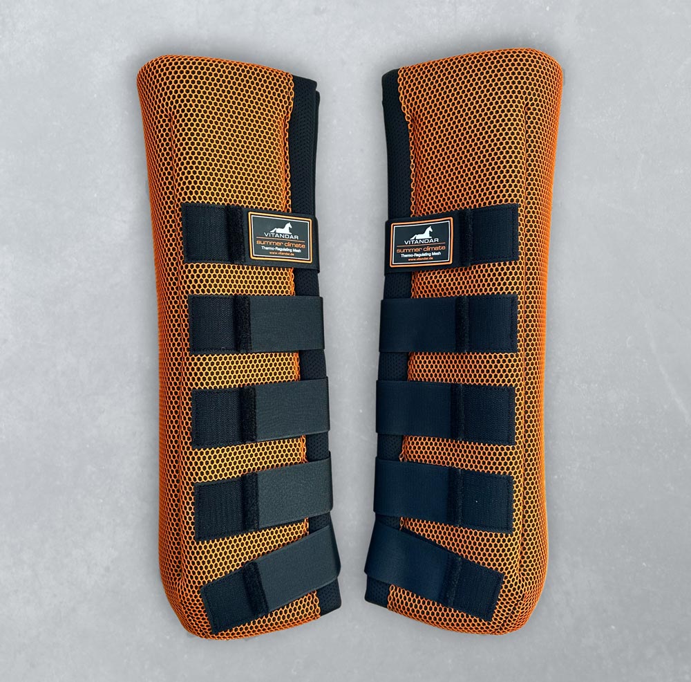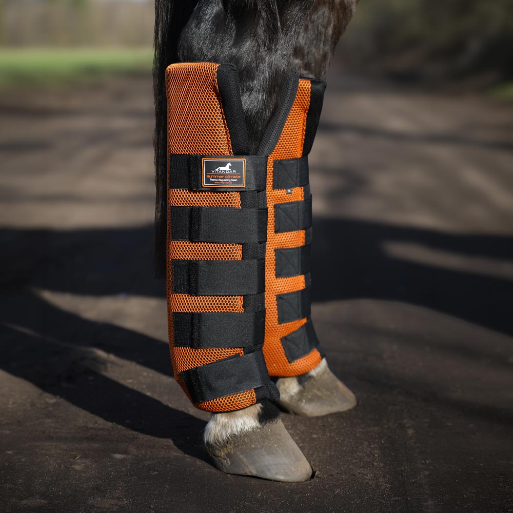 Die VITANDAR Stallgamaschen ‚Summer Climate‘ sind die Sommerversion unserer beliebten Stallgamaschen. Sie schützen die Beine, geben Stütze und fördern die Gesunderhaltung des Pferdes. Sie sind besonders atmungsaktiv durch das thermoregulierende Meshmaterial. Luft kann besser zirkulieren und Wärme wird vom Pferdebein weggeleitet. Durch den Luftstrom erzeugt das Mesh eine kühlende Wirkung. Der kompressierende Effekt der Gamasche unterstützt das Lymphsystem.